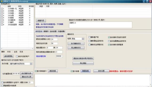 好友互动意思就是给自己好友群发消息,最大特点消息内容不限制数量条数,可以设置每批发送的好友数量,可设置某时间段发送过的好友不在重复发送,每个好友发送消息时间间隔,每条消息发送时间间隔,秒杀一切同类软件。
